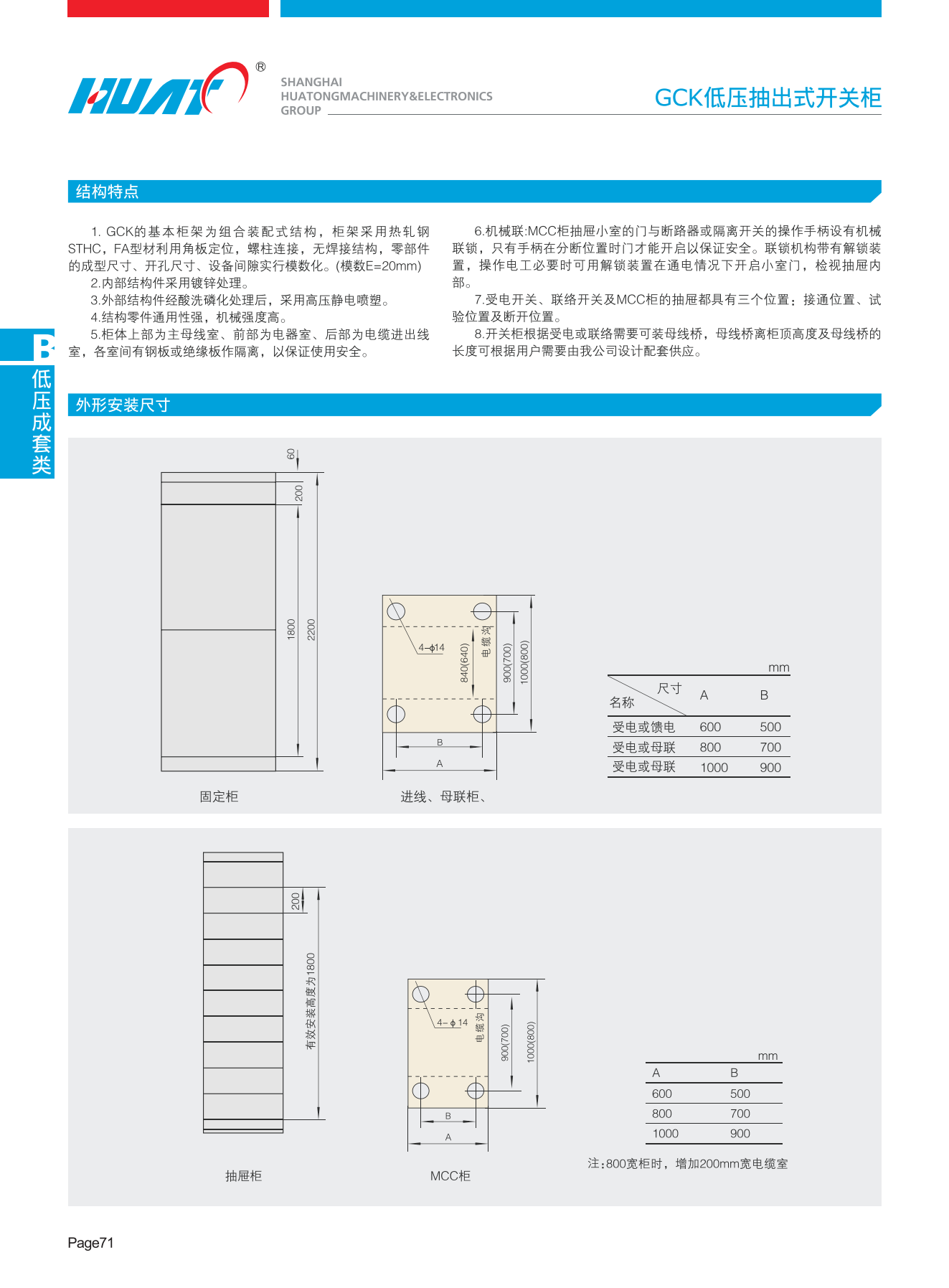 GCK型低压抽出式幵关柜(以下简称开关柜)适用于三相交流 50、(60)Hz,额定电压380(400)V、660(690)V,额定电流5000A及以 下的三相四线制及三相五线制电力系统,广泛应用于发电厂、变电 站、工矿企业、高层建筑、机场、车站码头以及广播电视等通信中 心,来作为发电、输配电、电能转换及电能消耗的动力配电中的PC和 电动机控制中心MCC。